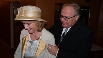 Hanka Vránová děkuje před představením výtvarnici Romaně Tůmové za nespočet převleků, které pro herce přichystala.